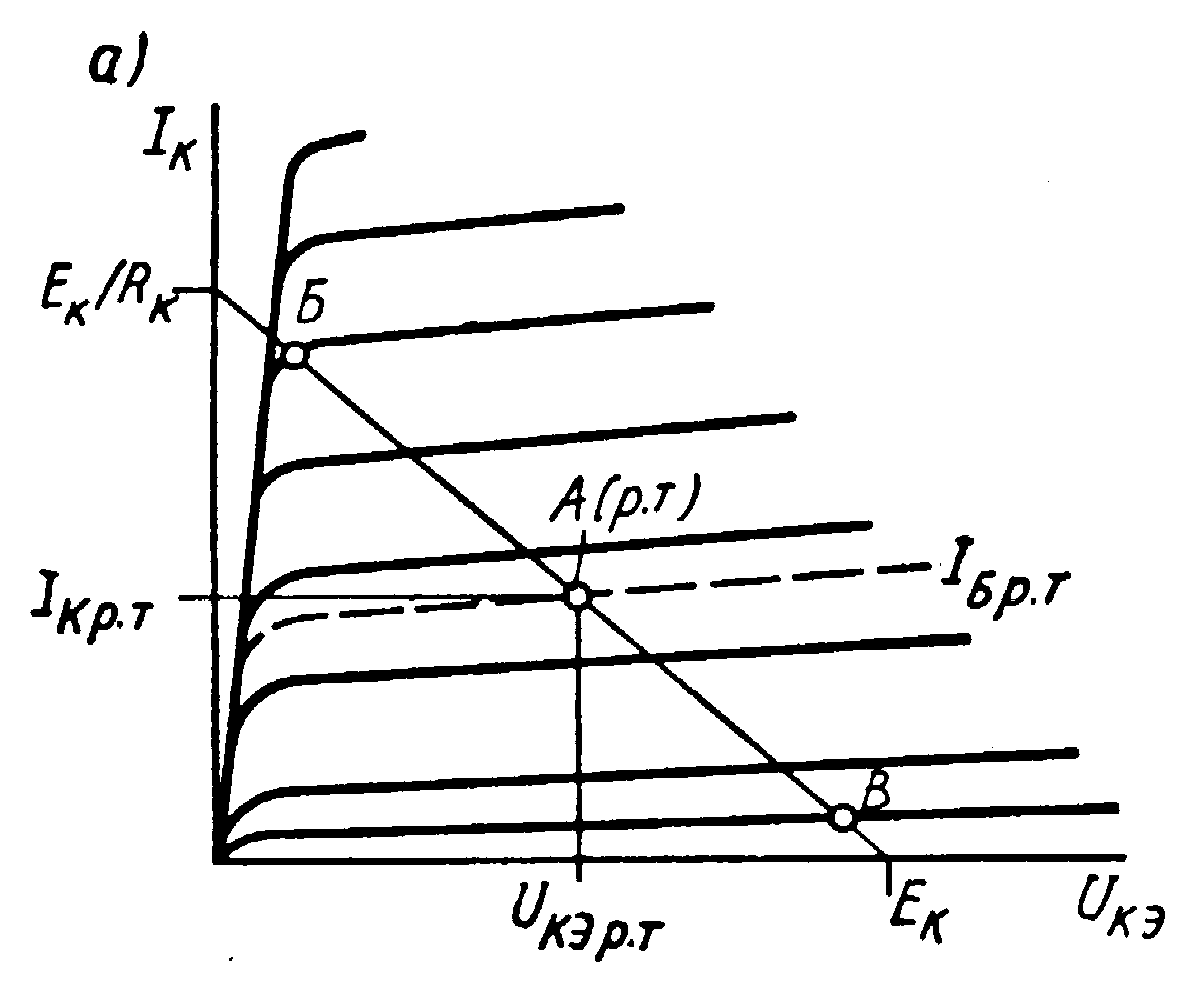 Рассмотрим процесс эмиттерной стабилизации рабочей точки. При росте температуры увеличиваются неуправляемый ток коллектора IКБ0, напряжение UБЭ р.т, а также токи базы IБ р т, и коллектора IК р т и, соответственно, растет падение напряжения на резисторе RЭ в эмиттерной цепи. В результате снижается напряжение смещения на эмиттерном переходе, определяемое из уравнения: