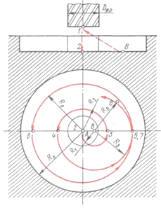 В иллюстрируемом случае спираль образована дугами полуокружностей радиусов R1 и R2 с центрами в полюсе B и дугой полуокружности радиуса R2 с центром в полюсе А. Полная траектория фрезы при обработке закрытой плоскости, ограниченной окружностью радиуса Rk, состоит из следующих частей: унастка ввода фрезы в зону резания (1-2), двухполюсной спирали (2-5), окружности радиуса Rэ (5-7), участка отвода фрезы от ограничивающей окружности радиуса Rk по сопряженной с окружностью радиуса Rэ, дуге окружности радиуса Rb (7-8) и участка возврата фрезы в исходную точку (8-1).