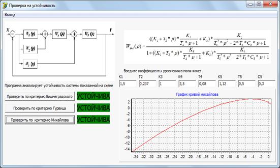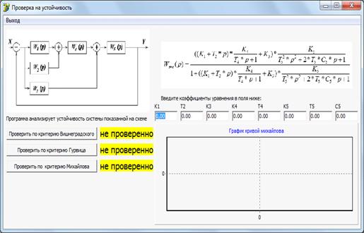 Unit1;, Messages, SysUtils, Variants, Classes, Graphics, Controls, Forms,, StdCtrls, ExtCtrls, jpeg, Menus, Buttons, TeEngine, Series,, Chart, TeeFunci;= class(TForm): TMainMenu; N1: TMeuItem; img1: TImage;: TLabel; img2: TImage; lbl2: TLabel;: TLabeledEdit; lbledt2: TLabeledEdit;: TLabeledEdit; lbledt4: TLabeledEdit;: TLabeledEdit; lbledt6: TLabeledEdit;: TLabeledEdit; lbledt8: TLabeledEdit;: TBitBtn; btn2: TBitBtn; btn3: TBitBtn;: TLabel; lbl4: TLabel; lbl5: TLabel;: TChart; Series1: TLineSeries;: TAddTeeFunction;N1Click(Sender: TObject); procedure btn1Click(Sender: TObject);btn2Click(Sender: TObject); procedure btn3Click(Sender: TObject);{ Private declarations }{ Public declarations };: TForm1; k1,k3,k4,k5,t4,t2,t5,a0,a1,a2,a3,c5:Real;chit();//считывание коэффициентов;vish();//Проверка по Вишнеградову;gyrv();//Проверка по Гурвицу;mich();//Проверка по Михайлову;{$R *.dfm}TForm1.N1Click(Sender: TObject);Close(); end;chit();:=StrToFloat(Form1.lbledt1.text); t2:=StrToFloat(Form1.lbledt1.text);:=StrToFloat(Form1.lbledt1.text); k4:=StrToFloat(Form1.lbledt1.text);:=StrToFloat(Form1.lbledt1.text); k5:=StrToFloat(Form1.lbledt1.text);:=StrToFloat(Form1.lbledt1.text); c5:=StrToFloat(Form1.lbledt1.text);;vish();:=Sqr(t5)*t4;a1:=2*t5*c5*t4+sqr(t5);a2:=t4+2*t5*c5;a3:=1(a0>0)and(a1>0)and(a2>0)and(a3>0)and((a1*a2-a0*a3)>0) then.lbl3.Caption:=('УСТОЙЧИВА');Form1.lbl3.Color:=clGreen;.lbl3.Caption:=('НЕ УСТОЙЧИВА');Form1.lbl3.Color:=clRed;;end;gyrv();:=Sqr(t5)*t4;a1:=2*t5*c5*t4+sqr(t5);a2:=t4+2*t5*c5;a3:=1;(a1>0)and((a1*a2-a0*a3)>0)and((a3*(a1*a2-a0*a3))>0) then.lbl4.Caption:=('УСТОЙЧИВА');Form1.lbl4.Color:=clGreen;.lbl4.Caption:=('НЕ УСТОЙЧИВА');Form1.lbl4.Color:=clRed;;end;mich();q:Integer;,e,r:Real;:Boolean;Form1.Series1.Clear;Form1.lbl5.Caption:=('Проверяется');Form1.lbl5.Color:=clBlue;:=0;q:=0 to 9 do:=w+0.2;:=-a0*(w*w*w)+a2*w;:=-a1*(w*w)+a3;.Series1.AddXY(r,e);(r<-3)and(e>0) then t:=True;;t=true then.lbl5.Caption:=('УСТОЙЧИВА');Form1.lbl5.Color:=clGreen;.lbl5.Caption:=('НЕ УСТОЙЧИВА');Form1.lbl5.Color:=clRed;;end;TForm1.btn1Click(Sender: TObject);chit(); vish();end;TForm1.btn2Click(Sender: TObject);chit(); gyrv();end;TForm1.btn3Click(Sender: TObject);chit();mich();end;.