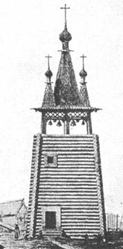 При этом следует заметить, что колокольни (в полном смысле этого слова, а не звонницы) появились сначала в виде отдельно стоящих сооружений и только во второй половине XVII века делаются первые попытки связать колокольню в одно целое с храмом. Это явление можно объяснить тем, что к тому времени, когда колокола окончательно утвердились в нашем церковном обиходе и размеры их стали значительными, к этому времени успели также вылиться в окончательно сложившуюся форму и типы наших древних деревянных храмов. Не рискуя нарушать установившихся архитектурных традиций, наши плотники вышли из этого затруднения тем путем, что стали трактовать колокольни как самостоятельные сооружения, располагавшиеся или с юго-восточной стороны храма, или с северо-западной.