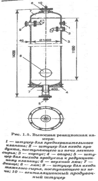 Выносная реакционная камера представляет собой цилиндрический аппарат большого объема (рис. 17.2), обеспечивающий длительное пребывание в нем сырья. Значительное влияние на работу сокинг-камеры оказывает направление движения сырья: нисходящее или восходящее (табл. 17.2). Использование восходящего потока позволяет значительно увеличить время пребывания жидкой фазы в зоне реакции и тем самым повысить степень превращения сырья.