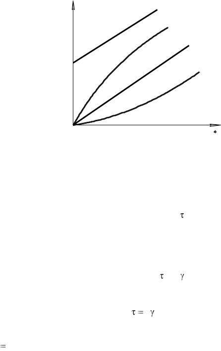 На рис. 1.3 изображены кривые течения некоторых наиболее часто встречаемых жидкостей. Линия 1 соответствует ньютоновской жидкости. Кривая 2 изображает закон течения псевдопластичных жидкостей, 3 – дилатантных, 4 – жидкостей Бингама. К псевдопластичным жидкостям относятся высокожирные сливки, сметана, мед,
