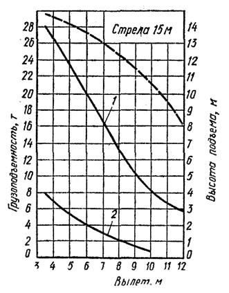 Рисунок 5. Грузовые (сплошные линии) и высотные (пунктир) характеристики крана КС-6471 со стреловым оборудованием: 1- на главном крюке; 2- на вспомогательном крюке