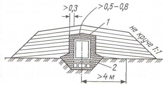 - засыпку грунтом пазух между стенками котлована и фундаментом с тщательным послойным уплотнение; возведение над трубой уплотненной грунтовой призмы. Засыпка трубы на высоту не менее 0,5 м производится наклонными слоями с откосом не круче 1:5, начиная от трубы, с тщательным уплотнением. Вблизи от стенок трубы и в пазухах для уплотнения используют электро - или пневмотрамбовки, на остальных участках – катки;