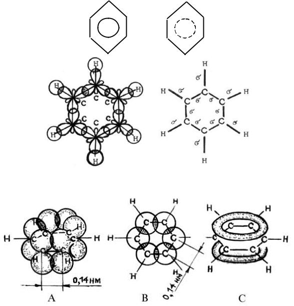 Под влиянием этого общего для молекулы -электронного облака и сокращаются расстояния между атомами углерода с 0,154 до 0,140 нм. Сочетание шести -связей с единой -системой называется ароматической связью. Цикл из шести атомов углерода, связанных ароматической свя-