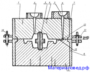 1 и нижней 2 полуформ, которые изготавливаются в опоках 7, 8 – приспособлениях для удержания формовочной смеси. Полуформы ориентируют с помощью штырей 10, которые вставляют в отверстия ручек опок 11. литниковая чаша 5, которая служит для приема расплавленного металла и подачи его в форму; стояк 6 – вертикальный или наклонный канал для подачи металла из литниковой чаши в рабочую полость или к другим элементам; шлакоуловитель 12, с помощью которого удерживается шлак и другие неметаллические примеси; питатель 13 – один или несколько, через которые расплавленный металл подводится в полость литейной формы. Для вывода газов, контроля заполнения формы расплавленным металлом и питания отливки при ее затвердевании служит выпор 4. Для вывода газов предназначены и вентиляционные каналы 9.