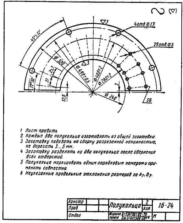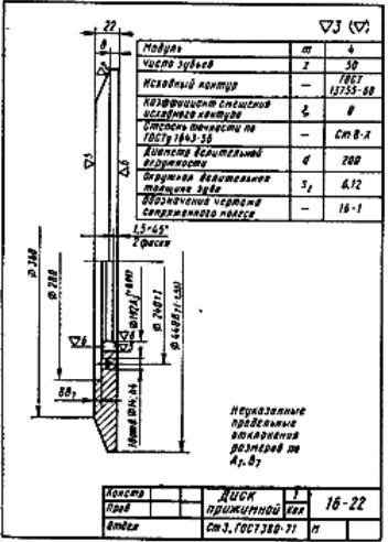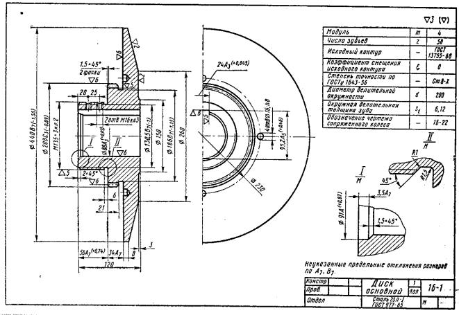 В зацеплении с диском 1 находится прижимной диск 22, установленный так, что плоскости обоих дисков Ø440 обращены одна к другой. Диски зажимают сборное фрикционное кольцо. Кольцо состоит из двух одинаковых полуколец 24, снабженных с обеих сторон фрикционными накладками 25 из асбестовой тормозной ленты. Накладки» прикреплены к полукольцам двумя рядами заклепок 4. К фрикционному кольцу со стороны фланца Ø440 на диске 1 восемью болтами 16 прикреплен фланец 2. Он насажен до упора на выступ Ø125С4 зубчатого колеса 3 и приварен к нему электросваркой швом типа Т4, ГОСТ 5264—69 с катетами 5 мм. Зубчатое колесо 3 насаживается на главный вал станка.