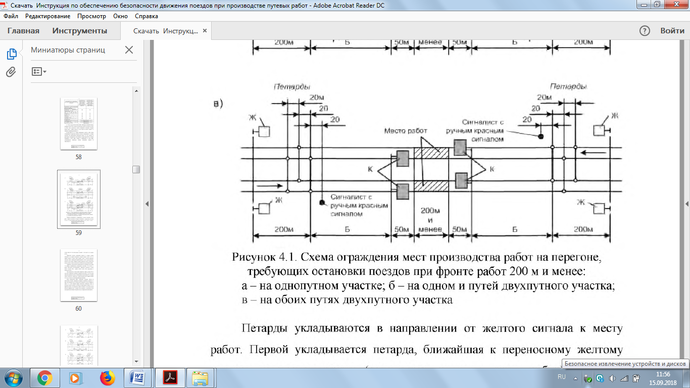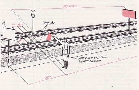 5. Сигналист с красным ручным сигналом занимает место 20 м от последней петарды в направлении к месту работ и находится на расстоянии не ближе 2 м от крайнего рельса.