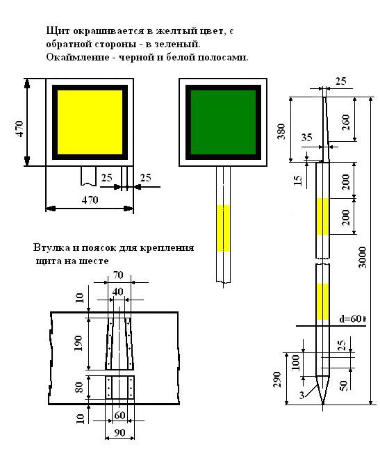 Переносной сигнал «Уменьшение скорости» - щит квадратной формы с одной стороны желтого цвета, а с другой зеленого цвета.