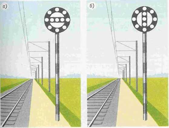 Сигнал «Уменьшение скорости» устанавливается с правой стороны по ходу поезда не ближе 3100 мм от оси крайнего пути на месте высотой 3 м. |
