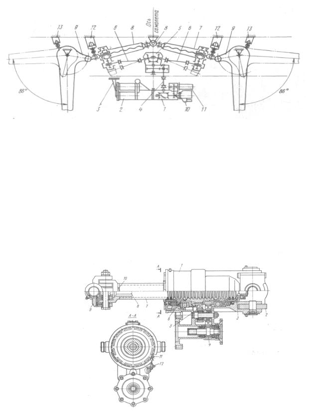 самолета Ту-144: 1 - редуктор; 2 - электромеханизм МУС-ЗПТВ; 3 - кронштейн; 4,6 - карданные валы; 5 - редуктор раздаточный; 7 - винтовой преобразователь ВП- 7; 8 - ось; 9 -поворотные узлы; 10 - механизм концевых выключателей МКВ-5Ш; 11 - механизм датчиков МДТ-САБ-4; 12,13 - концевые выключатели.