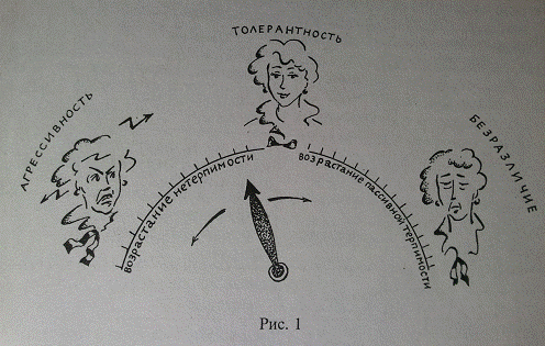 Хорошо показано место толерантности на шкале "агрессия - безразличие", толерантность в таком случае - это "золотая середина" между НЕтерпимым отношением к чему-либо или кому-либо и индифферентностью. (см. рис.1, [1, c.7.]) Интересен еще один синоним толерантности в контексте книги Д.С. Лихачева "Письма о добром". Термина "толерантность" Д.С. Лихачев не использует вообще, но все признаки толерантного поведения вкладывает в понятие интеллигентности человека: "Интеллигентность - это способность к пониманию, к восприятию, это терпимое отношение к миру и к людям". [3, с.36]