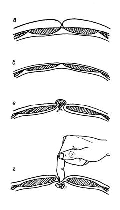 а – установка пальцев, б – образование «запаса свободной кожи»,