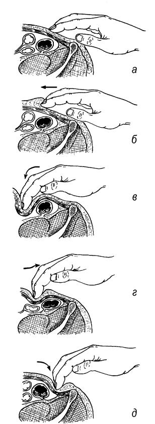 б – пальпация радиальным краем указательного пальца, который располагается параллельно кишке, скольжение через кишку производится в направлении, перпенди-