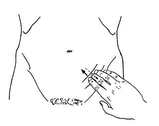 3)максимальное углубление пальцев в живот (по возможности до задней брюшной стенки), иногда в течение нескольких выдохов (надо научить пациента дышать животом, см.