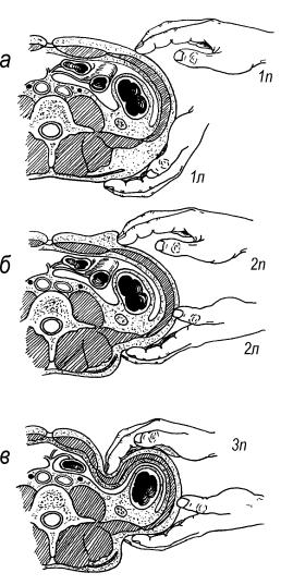 а – помещение пальцев левой руки под латеральную часть поясничной области (1 л) и установка правой руки кончиками пальцев над кишкой (1 п), б – приподнимание мягких тканей латеральной