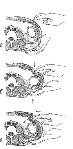 должны ощущать пальцы левой руки, находящиеся под поясничной областью) и скольжение по ней через кишку изнутри кнаружи.