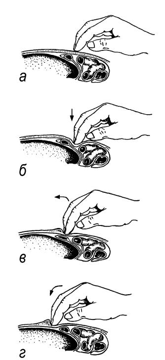 ку тыльной стороной пальцев вперед, пред ними образуется кожная складка, г – кишка выскальзывает из-под пальцев вниз.