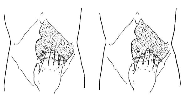 Толчкообразную пальпацию желудка начинают сразу ниже печеночной тупости по срединной линии тела. Необходимо попросить пациента сделать глубокий вдох и левой рукой надавить на нижнюю часть грудной клетки. При этом воздух из газового пузыря переместится в тело желудка и разъединит его переднюю и заднюю стенки на всем протяжении до большой кривизны (см. рис. 52). Два-три толчка, по крайней мере, один из которых сопровождается звуком влажного шлепка, удается сделать в самом начале выдоха, когда газа в теле желудка еще достаточно. Руку перемещают вниз на 1,5-2 см и повторяют исследование: глубокий диафрагмальный вдох, давление на нижнюю часть грудины, толчки в самом начале выдоха. Руку перемещают вниз до тех пор, пока звук влажного шлепка перестанет получаться при неоднократных попытках. Это означает, что граница желудка уже пройдена. Метка ставится выше пальцев.