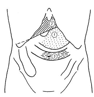 (3). Заштрихованы области, перкуссия которых дает громкий звук при нахождении стетоскопа над соответствующим органом.