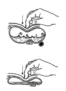 Для исключения наличия спаек между петлями кишок и селезенкой (или брюшной стенкой) можно использовать следующий прием (рис. 47). Концы II-IV пальцев помещают на живот выше пальпируемых кишок. Указательный палец сгибают так, чтобы его кончик скользил по коже с достаточно сильным давлением, а средний и безымянный остаются на месте, чтобы не образовалось кожной складки. Затем скользит по коже кончик безымянного пальца и, наконец, среднего. Кишка оказывается смещенной вниз на 1,5-2 см. Этот прием повторяют до тех пор, пока кишка не соскользнет с селезенки.