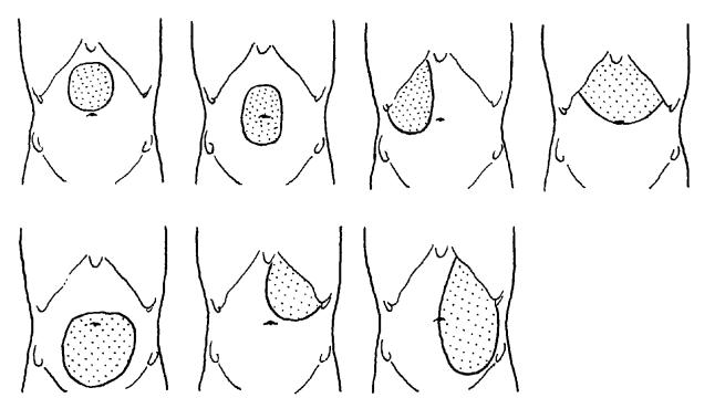 Кисты поджелудочной железы могут быть любых размеров, вплоть до гигантских. Они исходят из головки, тела или хвоста железы и в зависимости от этого и ряда других причин располагаются в разных областях живота, изменяя положение желудка и кишечника (рис. 57, 58). Основным методом исследования кист является пальпация. Они имеют гладкую поверхность и упругую резистентность. Несмотря на то, что кисты исходят из неподвижного органа, они нередко смещаются при дыхании пациента и при пальпации. Перкуссия может выявить тупой звук лишь при больших кистах, которые, раздвигая желудок и кишки, непосредственно прилежат к передней брюшной стенке. На рисунке 57 показаны варианты расположения кист поджелудочной железы относительно желудка и поперечной ободочной кишки по Керте с указанием характера перкуторного звука.