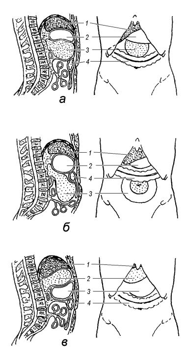 б – киста прилегает к передней брюшной стенке ниже поперечной ободочной кишки, часть кисты прикрыта петлями тонких кишок. Тупой звук определяется только над центральной частью кисты, которая непосредственно прилежит к брюшной стенке.