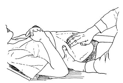 Обоснование метода. Во время вдоха сокращающаяся диафрагма смещает печень вниз. Ее задний край, не прикрытый брюшиной и фиксированный к диафрагме и нижней полой вене, ограничен в подвижности, поэтому печень поворачивается вокруг поперечной оси передним краем вниз, который даже в норме опускается ниже реберной дуги. Чтобы увеличить подвижность передненижнего края печени, В.П.Образцов предложил кистью левой руки обхватывать грудную клетку на уровне реберной дуги и слегка сдавливать, чтобы ограничить ее расширение во время вдоха (рис. 59, см. 2.2.15). Если пациент лежит на жесткой кушетке, сужение нижней апертуры грудной клетки можно проводить давлением всей ладонью левой руки, помещенной на грудную клетку над реберной дугой (Б.К.Панфилов, 1971, рис.