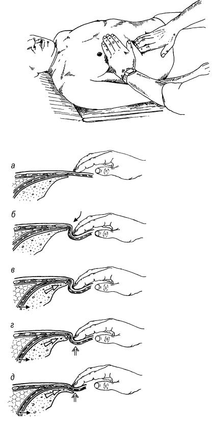 б – углубление пальцев в живот и задержка их в этой позиции;