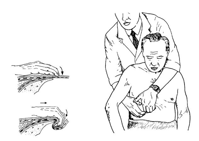Избыточный слой подкожного жира может мешать пальпации. В этом случае вводится еще один элемент пальпации: после установки руки в исходную позицию чуть выше необходимого уровня (на 1-2 см), прежде чем углубляться в живот, делают поверхностное скольжение вместе с кожей вниз, чтобы уменьшить толщину слоя подкожного жира перед пальцами. Избыточный жир можно отодвинуть вверх на ребра большим пальцем левой руки, которая обхватывает грудную клетку, ограничивая ее инспираторное расширение, или ладонью левой руки, которой надавливают на реберную дугу (когда пациент лежит на жесткой кушетке).