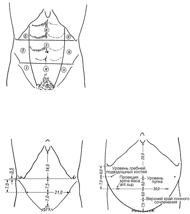 Двумя горизонтальными линиями живот делится на три этажа. Линия, соединяющая нижние точки реберных дуг (двуреберная, l.bicostalis), отделяет мезогастрий от эпигастрия. Линия, соединяющая передние верхние ости подвздошных костей (двуподвздошная, или межостная, l.biiliaca seu interspinalis) отделяет мезогастрий от гипогастрия. Линии, проходящие по наружным краям передних прямых мышц живота (ll.pararectales), делят каждый этаж живота на три области. Таким образом, различают девять областей живота (рис. 1):