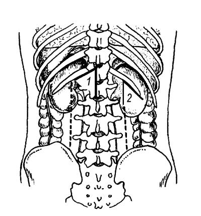 Рис. 4. Проекция органов на поясничные области. Пунктирные линии отделяют латеральные и медиальные части поясничных областей.