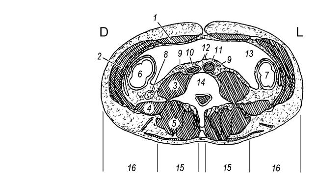 поперечная мышцы живота, 3 – большие подвздошные мышцы, 4 – квадратная мышца поясницы, 5 – мышца, выпрямляющая позвоночник. Ободочные кишки: 6 – восходящая и 7 – нисходящая, 8 – нижний полюс правой почки. 9 – мочеточники. 10 – нижняя полая вена. 11 – аорта. 12 – корень брыжейки тонкой кишки. 13 – брюшинная полость. 14 – поясничный позвонок. 15 – медиальные части поясничных областей. 16 – латеральные части поясничных областей.