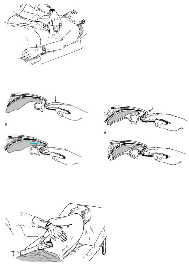 (симптом 2). Причиной боли и рефлекторной задержки дыхания считают соприкосновение пальпирующих пальцев через брюшную стенку с воспаленным желчным пузырем. Для выявления симптома Мерфи чаще пальпируют большим пальцем левой руки, в то время как другие пальцы лежат на реберной дуге (по Гленару, рис. 78а). Можно проводить пальпацию сразу двумя большими пальцами обеих рук (Прон, Ю.Хегглин, рис. 78б) или II-IV пальцами правой руки, которые вводят под реберную дугу.