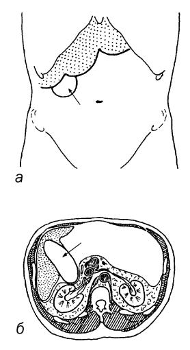 В некоторых случаях хронического холецистита увеличенный пузырь чуть отходит от печени, дно его опускается вглубь живота и между ним и брюшной стенкой оказываются петли кишок. Такой пузырь смещается в стороны, но перкуторный звук над ним тимпанический, его необходимо дифференцировать от ободочной кишки и почки. Он не дает поясничного контакта и отличается от кишки и почки по многим другим свойствам (см.3.3.8).