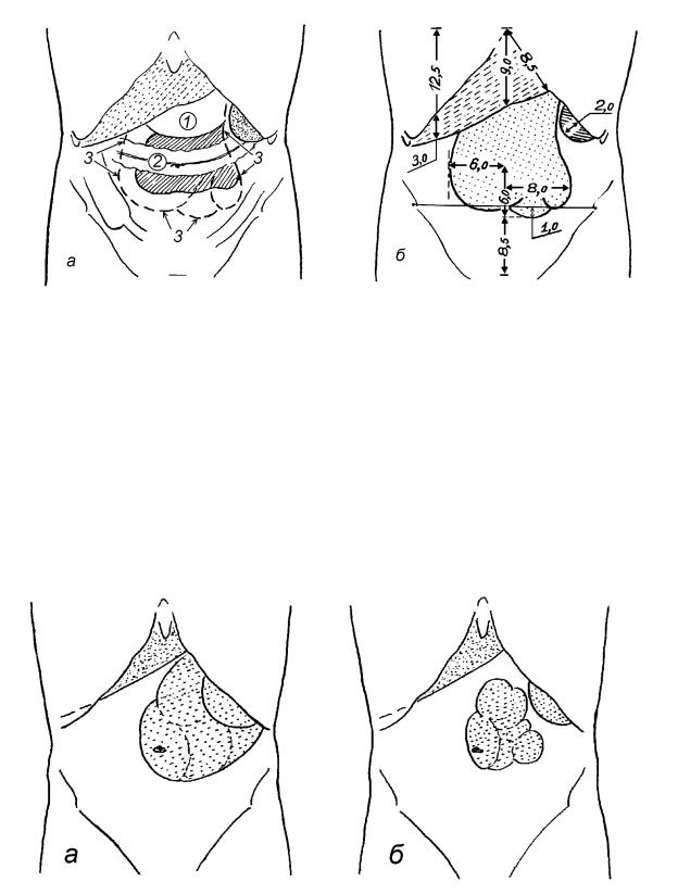 а – результаты пальпации и перкуссии: 1 – желудок, 2 – поперечная ободочная кишка, 3 – контур конгломерата, заштрихована область тупого перкуторного звука;