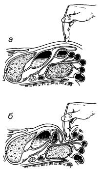 -движение кончиков пальцев не перпендикулярно брюшной стенке, а под острым углом,