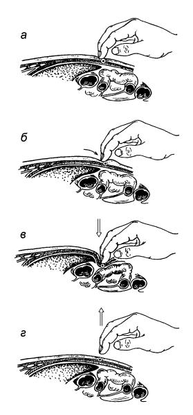 Точка на коже в позиции «а» находится над самым краем органа; она смещается под пальцами, но после приподнимания пальцев над телом (г) она возвращается на исходное место, где и будет отмечена граница.