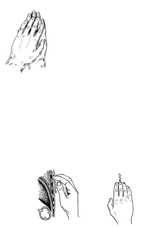 Во время пальпации внутренних органов тактильное чувство значения не имеет, т.к. исследование проводится через переднюю брюшную стенку и непосредственного контакта пальцев врача с органами пациента не происходит. Основную роль в создании в мозгу врача образа исследуемого органа играют импульсы от проприорецепторов, расположенных в суставных тканях, сухожилиях и мышцах врача. Значительное напряжение руки при пальпации, уменьшает количество движений в мелких суставах кисти и ухудшает четкость пальпаторных ощущений. Поэтому, если для преодоления сопротивления брюшной стенки требуется большое усилие, врач кладет кисть левой руки на правую пальпирующую руку и левой рукой осуществляет давление. При этом правая рука пальпирует без излишнего напряжения, а левая берет на себя основную физическую нагрузку. Кисть левой руки кладется на правую так, чтобы кончики V, IV, III и II пальцев левой руки лежали приблизительно на головках средних фаланг соответственно II, III, IV и V пальцев правой руки (рис. 15).