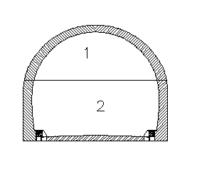 Вначале с опережением на 50-100м проходим калотту 1, затем раскрываем нижний уступ 2. После полного раскрытия выработки бетонируем обделку за один приём