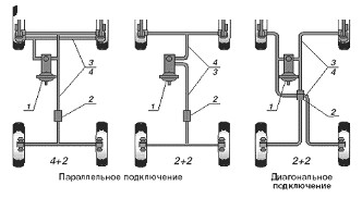 ü 2 + 2 подключенных диагонально - правый передний + левый задний и так далее;