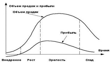 Классический жизненный цикл товара включает 5 этапов, а на рынке готовый товар проходит четыре стадии: внедрение на рынок, рост, зрелость, спад. (Рис.1.)