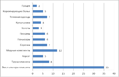 По данным диаграммы видно, что наибольшую долю в ассортименте магазина занимают сектор бюстгальтеры (35%), модные комплекты (12%) и трусы классика (8%). Остальные товары находятся примерно на одном уровне.