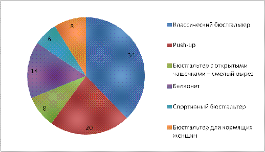 По данным диаграммы видно, что наибольшую долю составляют бюстгальтеры классические (34%) и бюстгальтеры push-up (20%), остальные виды бюстгальтеров находятся примерно на одном уровне.