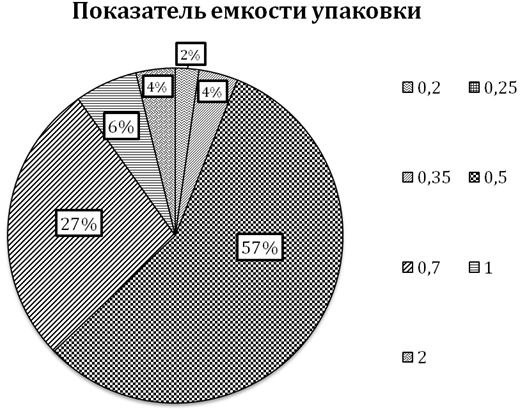 Как видно из приведенного выше рисунка 2, традиционные для коньяка бутылки емкостью 0,5 и 0,7л составляют большую часть торгового ассортимента товаров, а именно 57 и 27%.