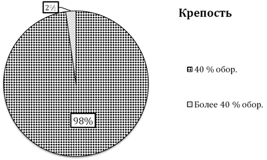 Как видно из рисунка 4, систематизация торгового ассортимента коньяков по крепости напитка нецелесообразна, поскольку подавляющую часть торгового предложения, а именно 98% опрошенных, отражающаяся на показателях реализованного спроса составляют коньяки 40%-ной крепостью.