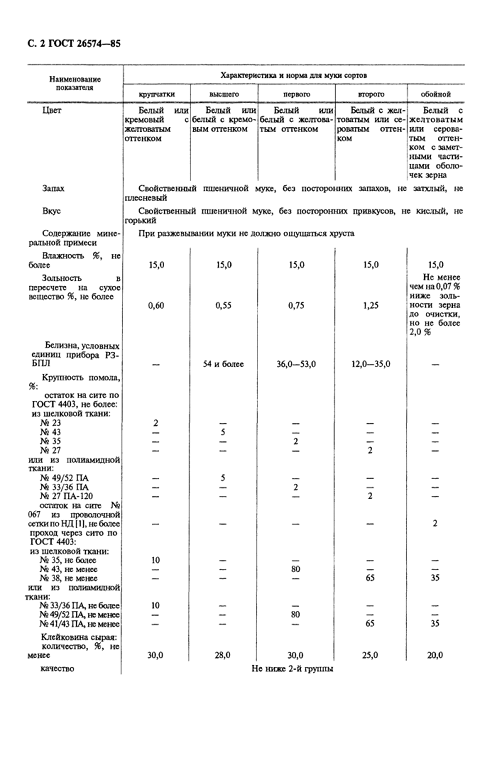 Муку 2-го сорта вырабатывают из мягких пшениц. Частицы ее неоднородны по крупности; цвет белый с желтовато-сероватым оттенком; выход муки - до 85%; зольность - 1,25%; содержание клейковины не менее 25%. Ее используют для приготовления хлеба.