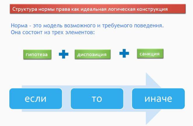 Структура нормы права — это идеальная логическая конструкция, призванная регулировать взаимоотношения между людьми. Это своеобразная модель возможного поведения, сформировавшаяся в ходе общественного развития, отражающая стремление людей создать универсальные, долговременные «инструменты» познания и освоения правовой действительности. Традиционно считается, что норма права состоит из трех элементов: гипотезы, диспозиции и санкции."