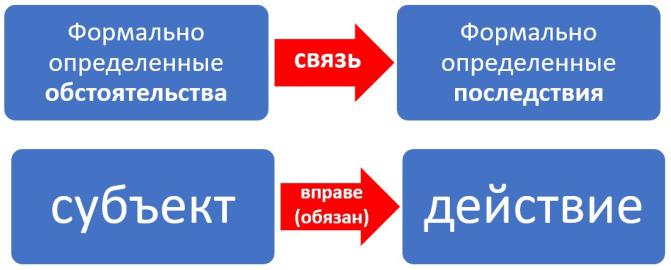 Норма права образуется благодаря установлению связи между формально определенными обстоятельствами (первый элемент нормы) и формально определенными последствиями (второй элемент нормы). Первый элемент нормы традиционно называется гипотезой (регулятивной нормы)