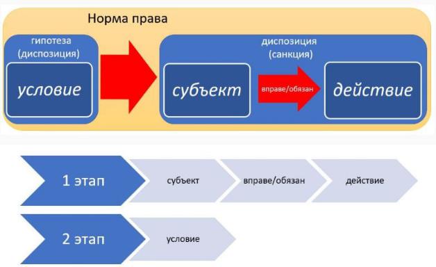 Мыслительные операции, описанные в данном алгоритме, носят универсальный характер и применимы ко всем видам норм права, однако требуется учитывать особенности приемов юридической техники, которые используются при создании разных видов норм. Рассмотрим применение данного алгоритма на приме регулятивных норм, состоящих из гипотезы и диспозиции.